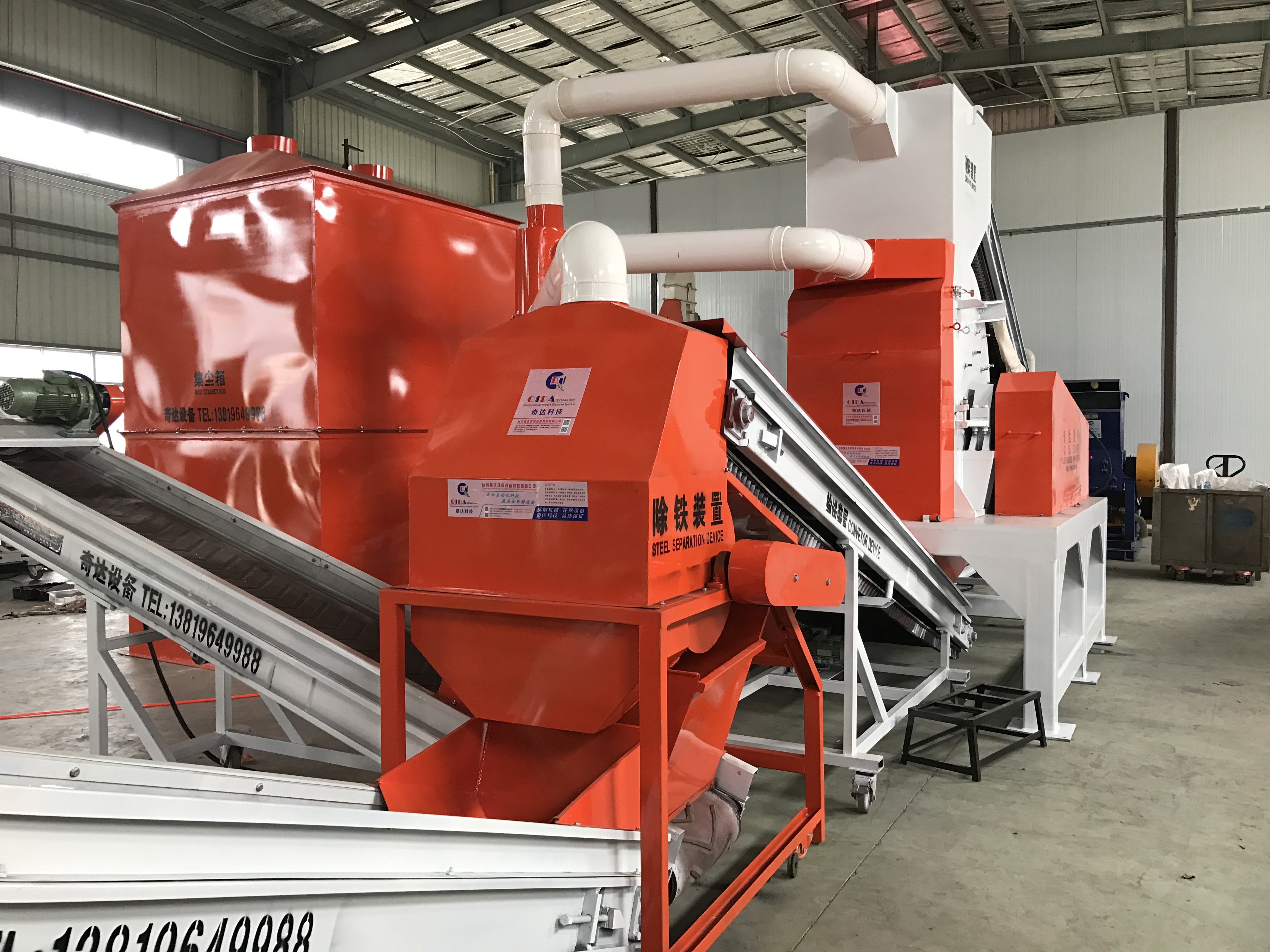 The whole process is carried out in negative pressure.Before feeding the materials, hard materials like large shafts, bearings, gears, large pieces of hard iron, etc. need to be taken out in advance. The remainings enter the primary crusher first, the crushed mixtures will be conveyed to strong magnetic roller sorting machine to obtain non-ferrous metal and iron, and then the no-ferrous mixture material is conveyed to crusher for a second crushing, followed by air separator to get copper and non-metal materials. During the crushing and sorting process, a pulse dust removal system is configured to solve the dust emission effectively.